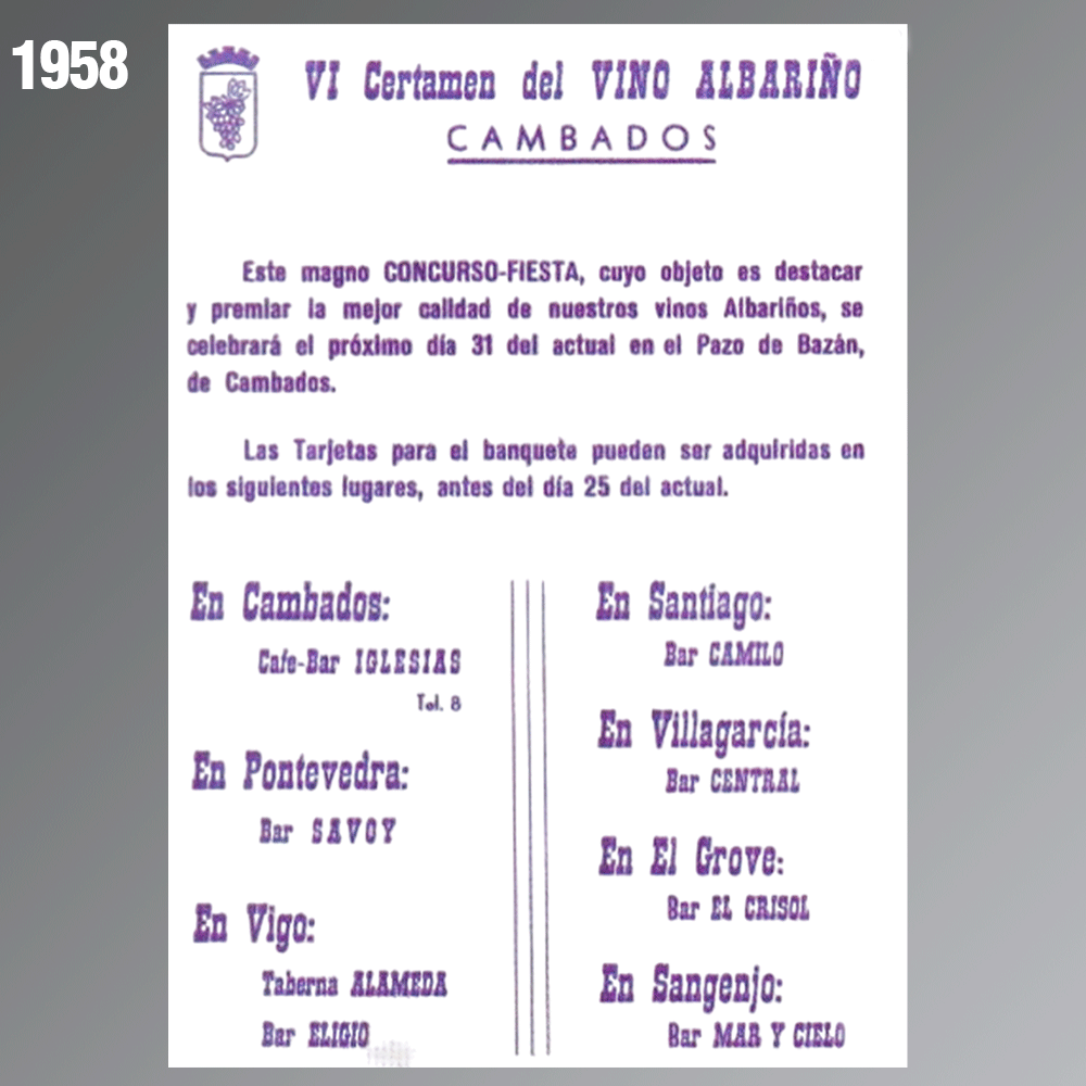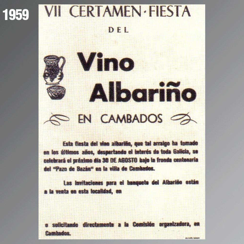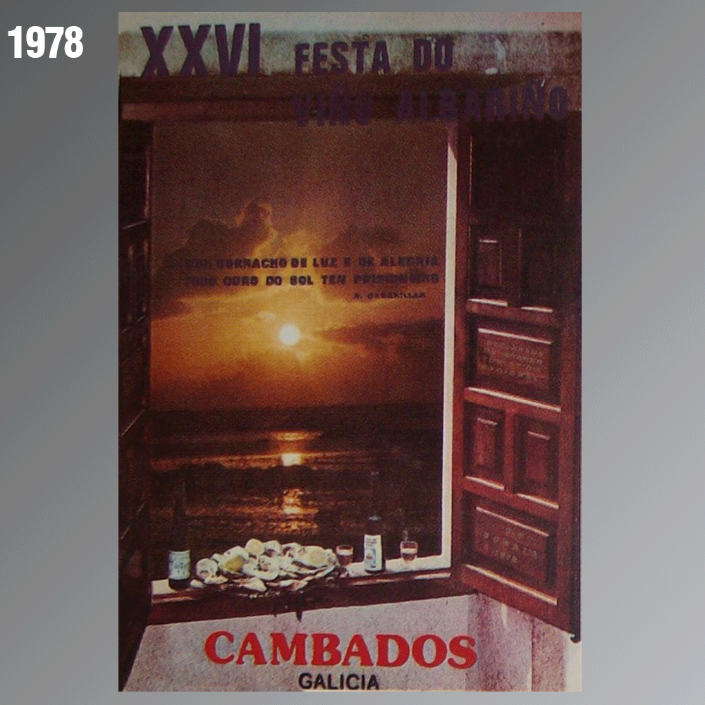 El primer cartel anunciador de la fiesta fue editado en 1958. En esta galería faltan los carteles de los años 1960, 1961, 1962 y 1966, pero hay constancia de que fueron editados. Las restricciones por la pandemia de Covid-19 no permitió la celebración de la edición de la Festa do Albariño en 2020 por lo que tampoco existe ese cartel.